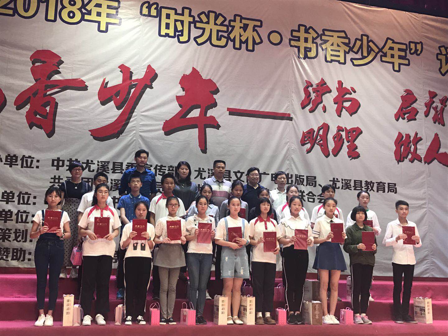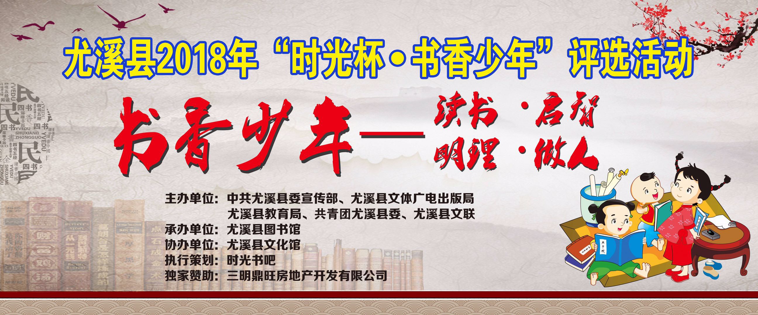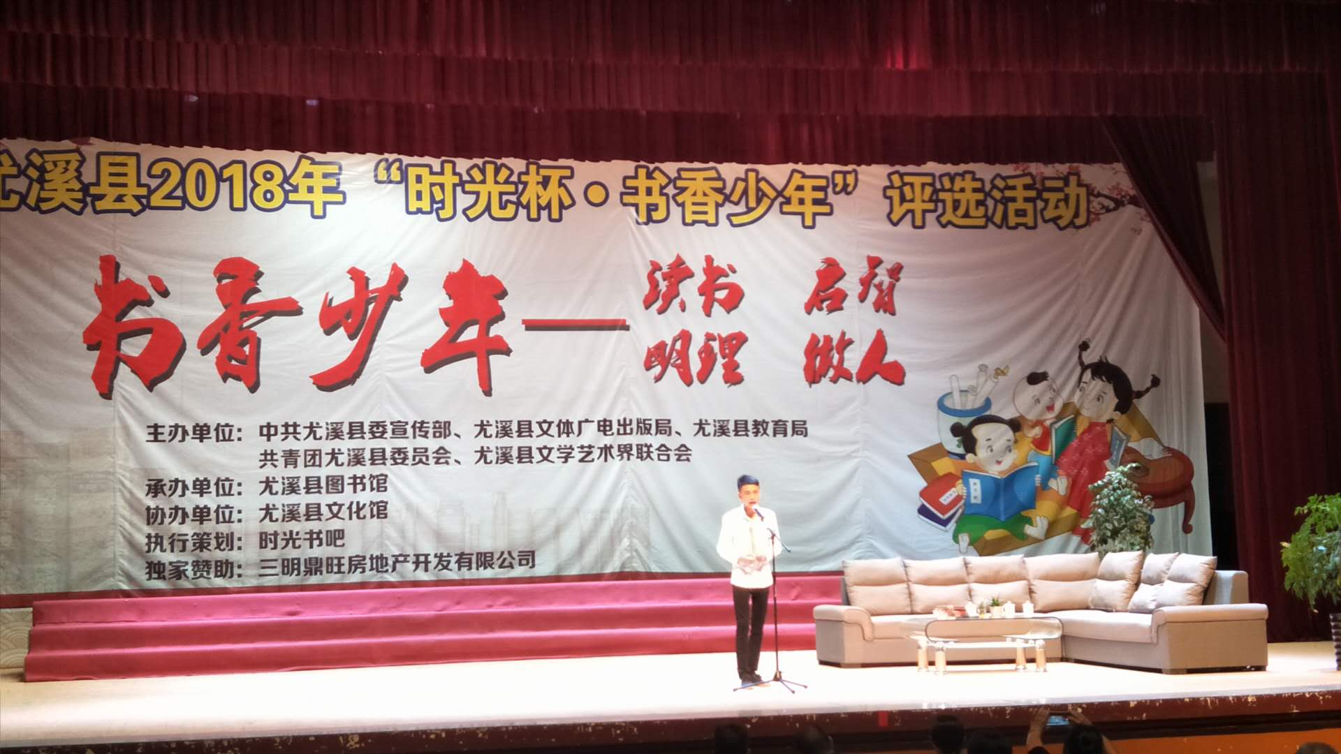 5月12日,由尤溪县委宣传部、尤溪县文广局、尤溪县教育局主办,共青团尤溪县委员会,尤溪县文学艺术界联合会,尤溪县图书馆承办,三明鼎旺公司独家赞助,尤溪县时光书吧策划并执行的“书香少年”评选活动在县沈城影院举办。到场领导有:宣传部副部长:肖荣鉴,文广局:姜校斌局长,教育局:詹焕生局长,团县委:陈思书记,文联:张世铨主席。活动特别邀请了省教育系统关工委书香少年选拔赛省级总决赛的评委曹欣老师和林迪英老师,尤溪七中陈当尧老师当任本次活动评委。