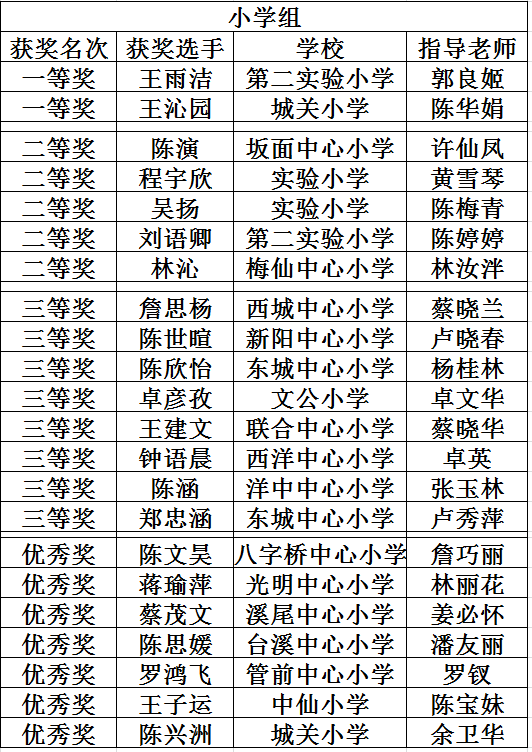 经过激烈的比赛,评委们也评选出最终的成绩 中学组由尤溪一中.王立凡 联合中学.姜红宇获得一等奖 。小学组由城关小学.王沁园.第二实验小学.王雨洁获得一等奖