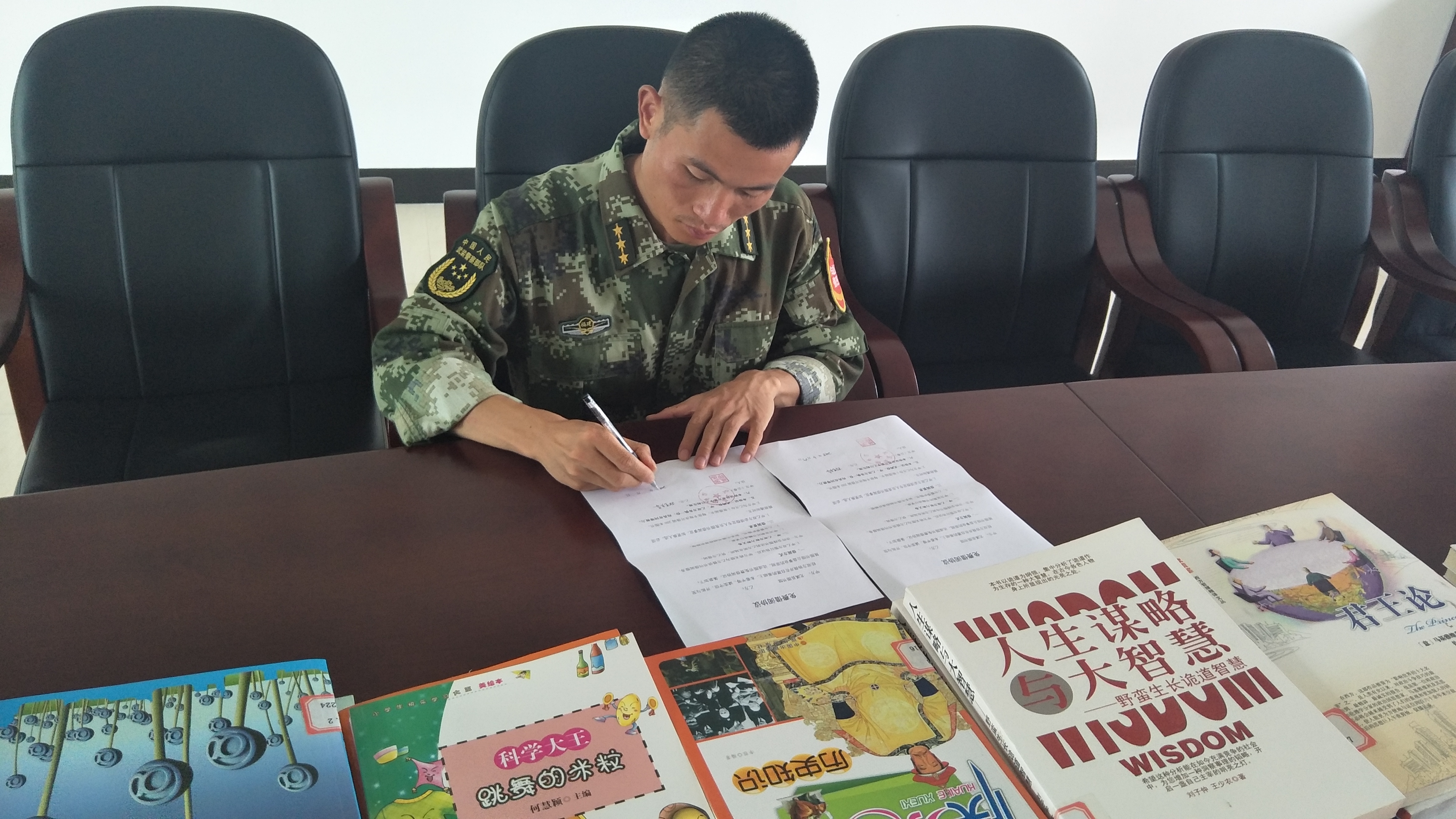 看着战士们专注读书的神情,县图书馆的工作人员也开心地笑了。新书赠送仪式结束后,部队首长带领大家参观了中队图书室,并进行了座谈。